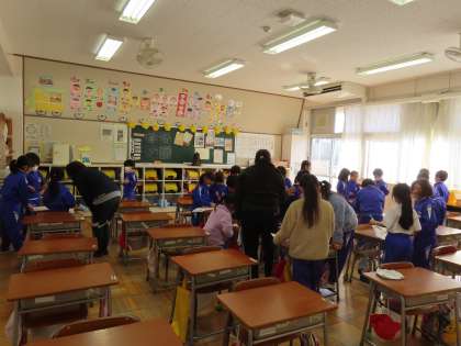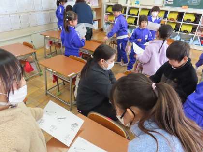 1月17日(金)1年生 外国語活動 公開日 2025/01/17 更新日 2025/01/17 できごと(2024) 1年生の外国語活動では、ALT、担任の先生や友達と身の回りの文房具の英語での言い方を楽しんでいました。日本語とは違うね!英語の音ってなんだかおもしろいな!そう感じることで、どんどん英語を好きになってもらいたいです。また、今日の1年生のように、英語を使って友達など人と関わることの楽しさをたくさん味わってしいです。