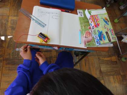 「電気の通り道」の学習に入りました。今日の問いは電気を通す物と通さない物について考えることです。自分の身の回りのものをよく見て、予想していました。色々な物のことを知りたくて仕方ない様子でした。また同じ物でも、電気を通す所と通さない所があること、電気を通す性質など、さらにこのあと学習を深めていきます。