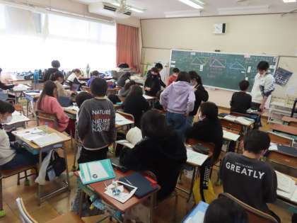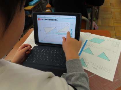 三角形の面積の求め方を考えていました。今日はタブレット上の教材や図を使って考えました。真剣に図形と向き合って、切ったり動かしたりしながら一生懸命考えていました。面積の求め方が分からなくても、「これまで」の学習を頼りにして求められることが分かりました。算数っておもしろい!