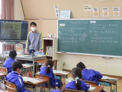 1年生にとって理解できる数字がどんどん大きくなっていきます。なんと!今日は「100(百)」が分かるようになりました!しかも、100は「10のかたまりが10こ」も分かりました。他にも「99より1こおおい」「50を2こあつめると100」などいろいろな見方、考え方が出てきました。すごいですね!