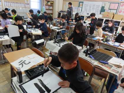 1月23日(木)3年生 書写 公開日 2025/01/24 更新日 2025/01/24 できごと(2024) 今日は筆使いに気を付けて「曲がり」の学習です。速さ、力加減、筆の向きなどの動かし方などに気を付けて「元」を書きました。 「書き初めみたいに、金賞が もらえる?」 「自分で 自分の作品に 金賞をあげられるように がんばろうよ!」 「そっか。そうだね!」 個性豊かで十人十色の作品が見られました。