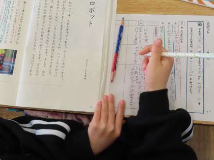 1月24日(金)2年生 国語 公開日 2025/01/24 更新日 2025/01/24 できごと(2024) 「ロボット」の学習です。今日は、ロボットについての3つの問いかけについて、文を読んで答えがどこに書かれているかな?よく読み取って正しく答えることができるようになりました。読み取り表のワークシートを使って学習を進めていますが、みんな丁寧に、そして書くのがはやくなりました。