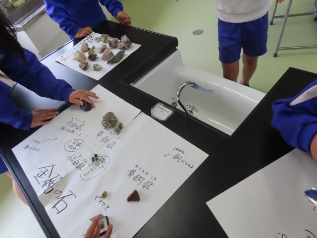 4年生の理科は、先生が準備したたくさんの鉱石や化石から自分のお気に入りの石を見つけていました。とてもきれいな石や、珍しい石を見て、子どもたちは目を輝かせていました。