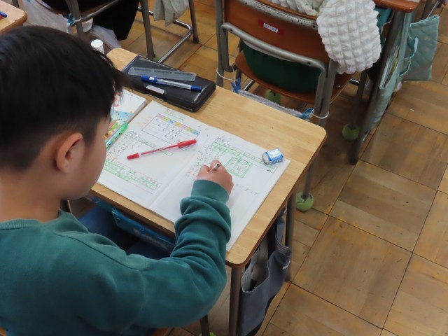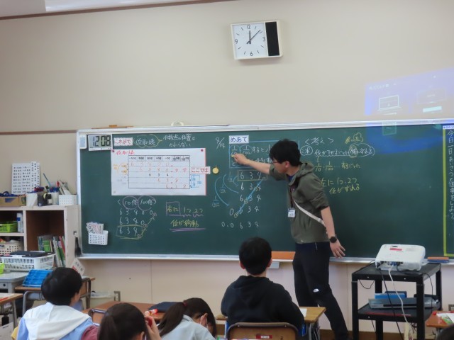5年生の算数は「数のしくみを調べよう」の学習に取り組んでいました。数を10分の1、100分の1すると小数点はどうなるかについて考えていました。10分の1、100分の1すると小数点が一つずつ左へずれることが分かりました。