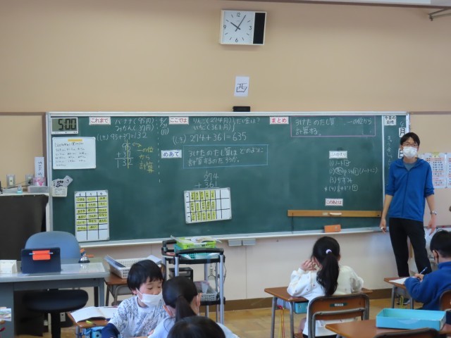 4月21日(月)3年生算数 公開日 2025/04/21 更新日 2025/04/21 できごと(2025) 3年生の算数は、3桁+3桁の計算の学習をしていました。数が大きくなってきましたが、既習事項を思い出しながら学習に取り組んでいました。