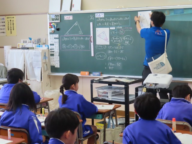 4月23日(水)5年生算数 公開日 2025/04/23 更新日 2025/04/23 できごと(2025) 5年生の算数は図形の角の大きさの学習をしていました。今日は三角形の内角の和が180度になることを利用して、問題に取り組んでいました。