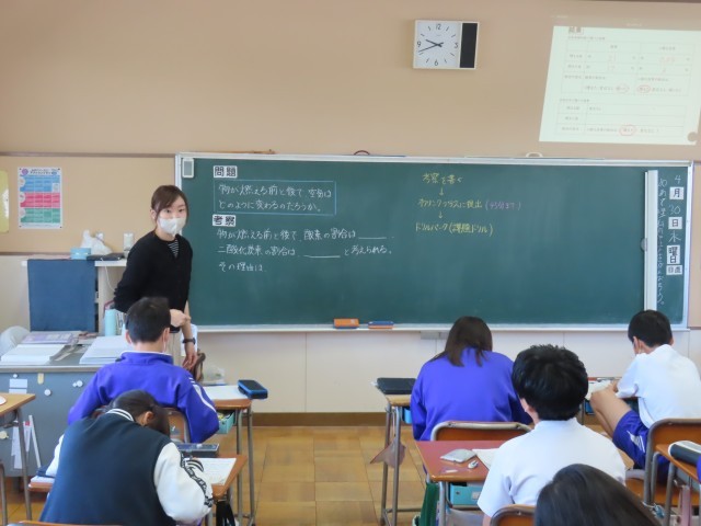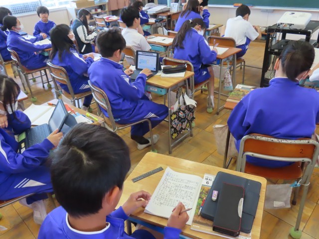 6年生の理科ではものが燃えた後の空気がどうなるかについて実験してきました。今日は今までの実験をもとに自分の言葉でノートに考察を書いていました。みんなしっかりと書けていました。