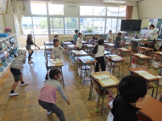 2年生が教室で音楽の学習をしていました。体を動かしながらノリノリで歌を歌っていました。