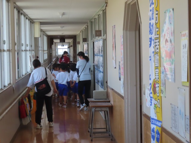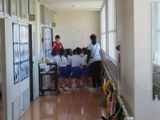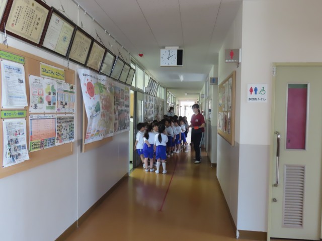 1年生が生活科で学校探検をしていました。今日は南校舎を探検し、3階の大きな子達の教室や1階の職員室を見学していました。