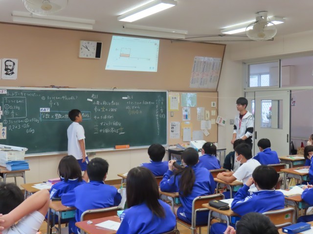5月2日(金)6年生算数 公開日 2025/05/02 更新日 2025/05/02 できごと(2025) 6年生の算数は、新しい単元「分数と整数のかけ算とわり算」の学習がスタートしました。今日は分数×整数の計算の仕方を考え、その考えを発表していました。
