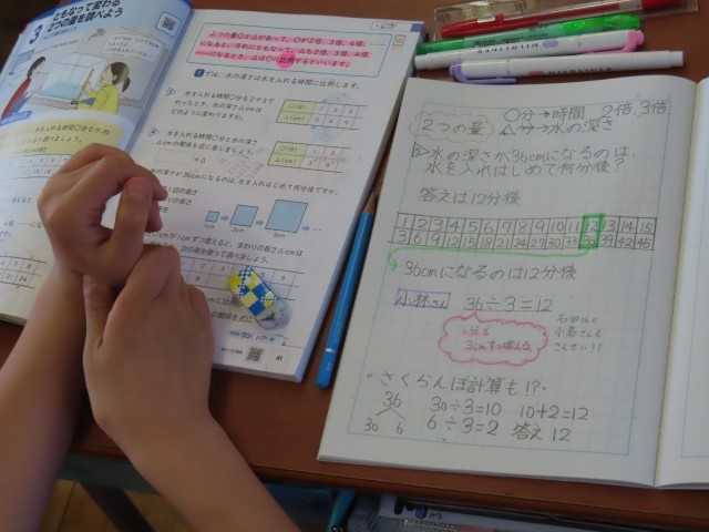 5月8日(木)5年生算数 公開日 2025/05/08 更新日 2025/05/08 できごと(2025) 5年生の算数は、ともなって変わる2つの量の関係について学習しています。今日は正方形の1辺が1㎝ずつ増えると周りの長さがどうなるかについて考えていました。