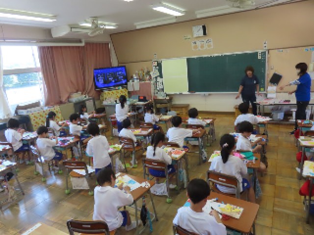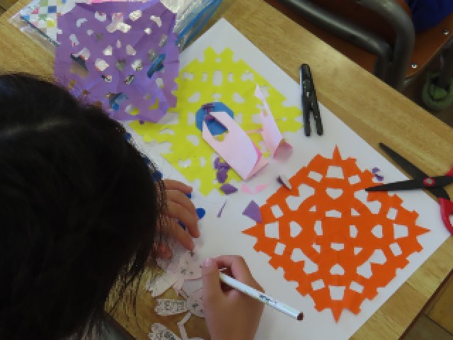 5月13日(火)1年生図工 公開日 2025/05/13 更新日 2025/05/13 できごと(2025) 1年生が図工の学習をしていました。折り紙を折って、ハサミで切り、それを画用紙に貼り付けていました。みんな思い思いの作品を作っていました。