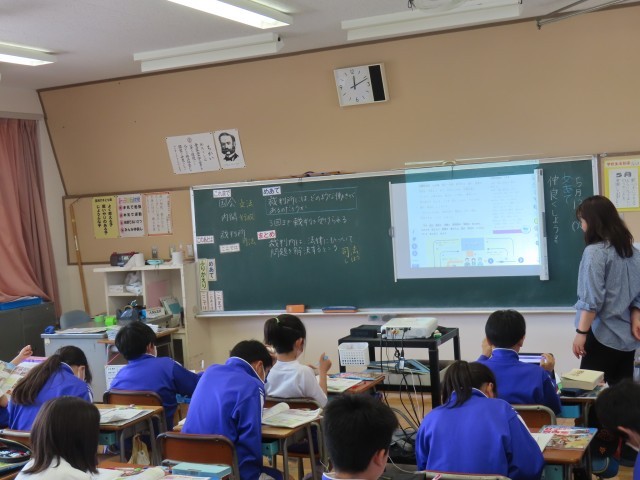 5月13日(火)6年生社会 公開日 2025/05/13 更新日 2025/05/13 できごと(2025) 6年生の社会では、国の政治や選挙の仕組みについて学習しています。今日は、裁判所の働きについて学習していました。