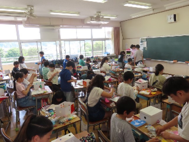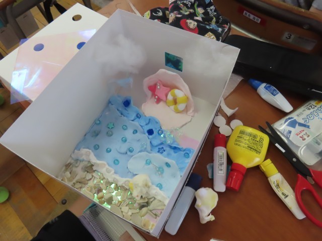 5年生の図工は箱の中に自分で考えたものを配置して外から覗く作品を作っています。みんな思い思いの世界を作っています。