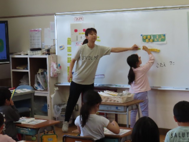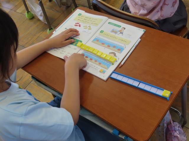 5月28日(水)1年生算数 公開日 2025/05/28 更新日 2025/05/28 できごと(2025) 1年生の算数はたし算の学習をしています。今日は4+3の計算をブロックを使って学習していました。