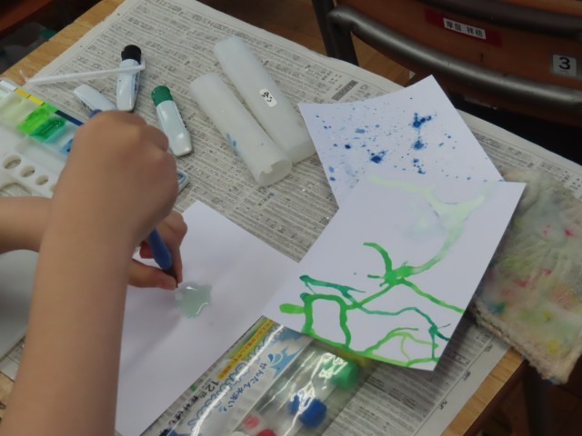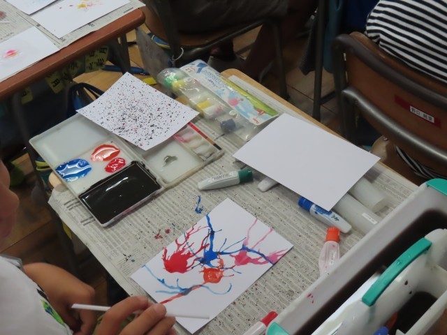 5年生の図工は「心のもよう」というこで、小さい画用紙の上に、絵の具を使い色々な技法で模様を表現していました。