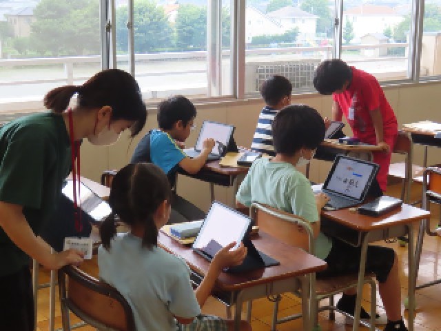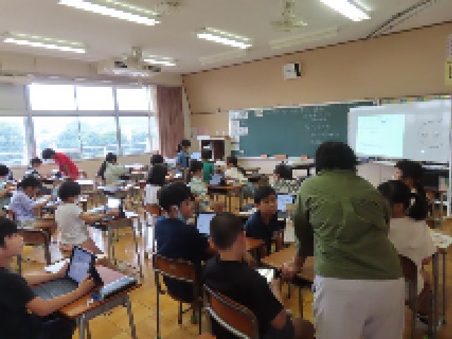 4年生が外国語活動の学習をしていました。今日は「自分のすきな時間とその理由を考えてよう」をめあてにタブレットにアルファベットを打ち込んでいました。
