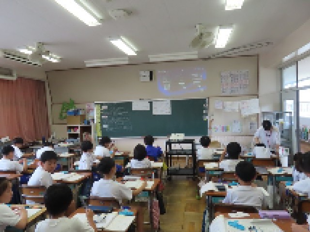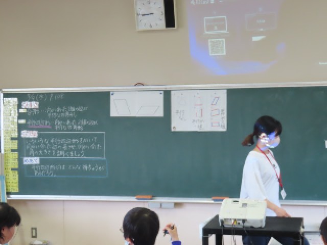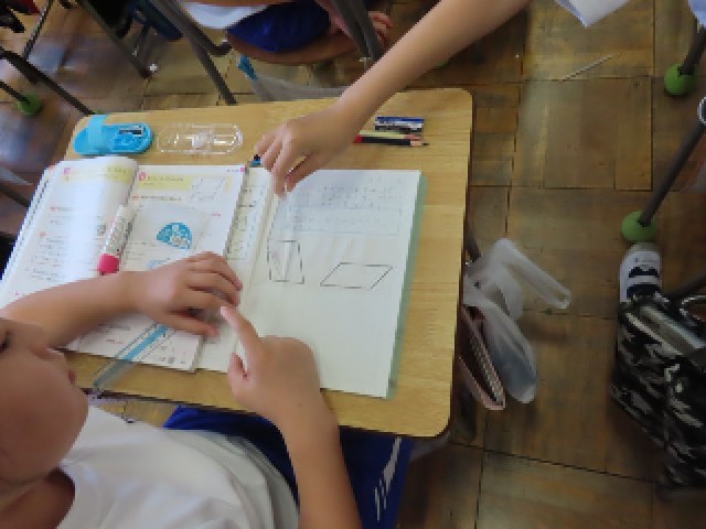 4年生が算数で図形の学習をしていました。今日は「平行四辺形にはどんな特徴があるのだろう」をめあてに図形を見ながら友達と話し合っていました。