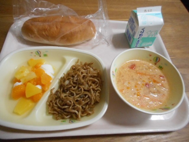 せわりパン、牛乳、ソース焼きそば、トマトと卵のスープ、フルーツ杏仁