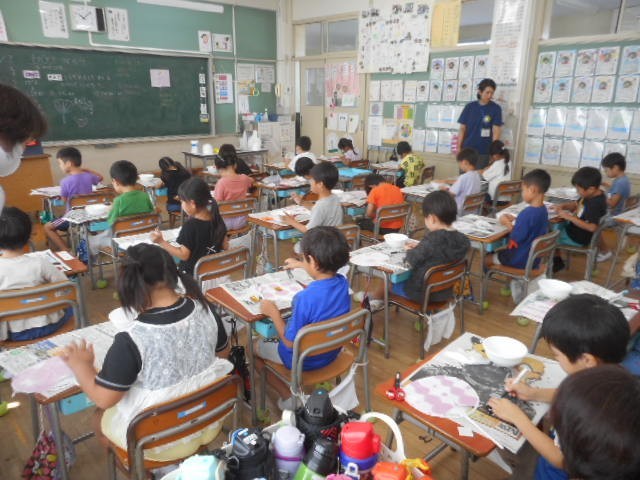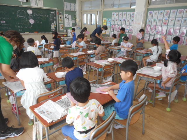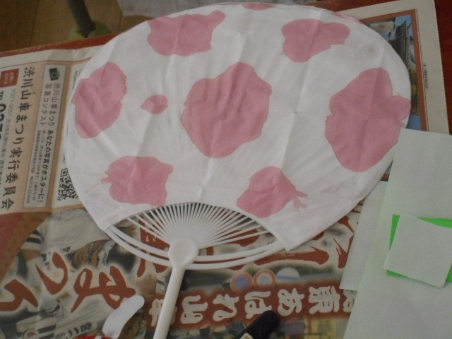 大事に育てたアサガオの花を搾った汁で和紙を染め、うちわづくりをしました