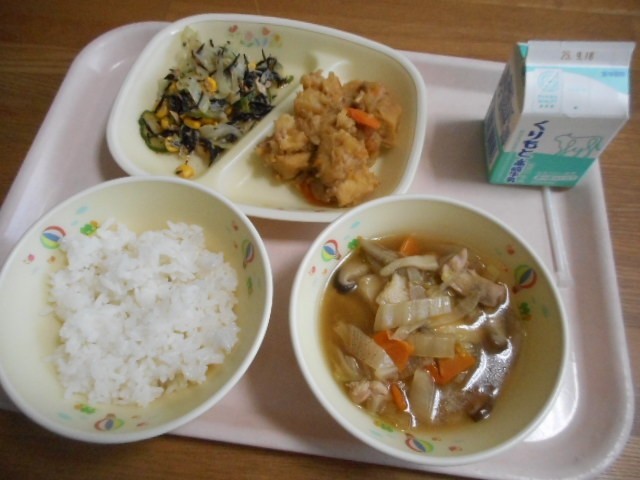 ごはん、牛乳、ジャガイモのそぼろ煮、せんべい汁、ひじきサラダ