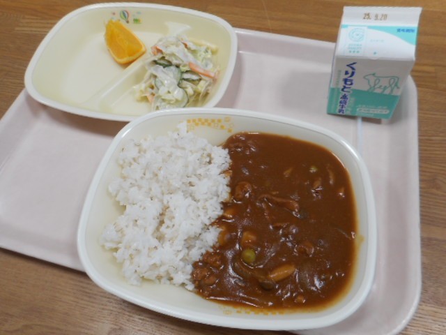 麦ごはん、牛乳、ハッシュドポーク、ゴボウとマカロニのサラダ、オレンジ