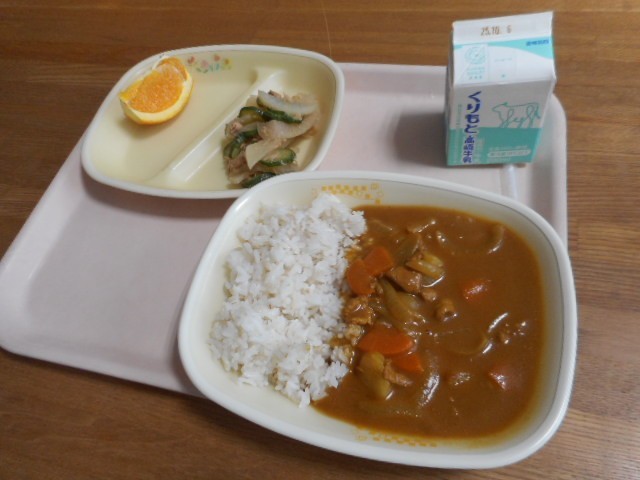 麦ご飯、牛乳、ポークカレー、大根とツナのサラダ、オレンジ