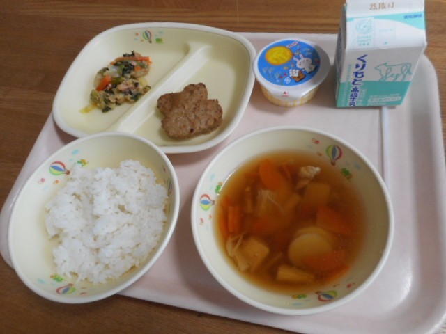ごはん、牛乳、うさぎハンバーグおろしソース、お月見汁、小松菜サラダ、お月見ゼリー