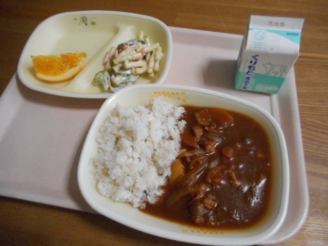麦ごはん、牛乳、ハヤシシチュー、マカロニサラダ、オレンジ