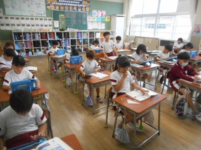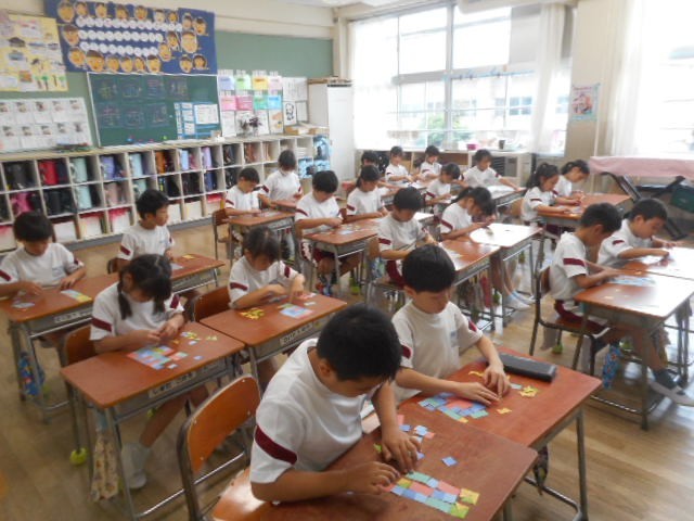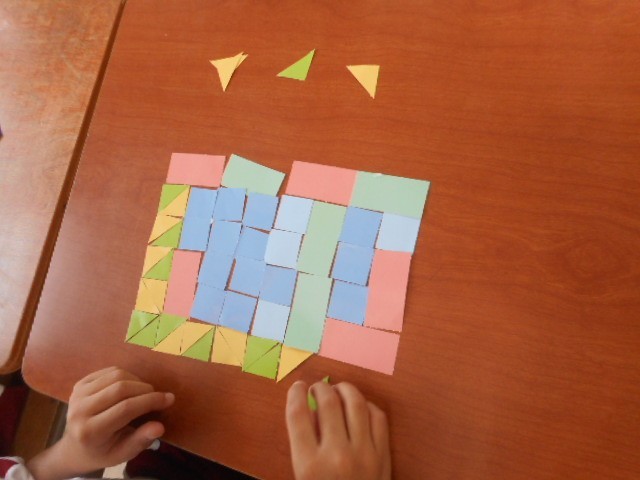 正方形、長方形、直角三角形を隙間無く並べて、模様を作りました