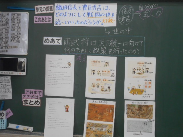 両武将の行ったことについて、庶民や武士の立場をとり、メリットデメリットを考え、どのような考えで世の中を治めようとしたのか考察しました