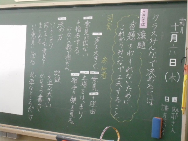 「宿題を忘れない工夫」を題材にして、話し合いをしました