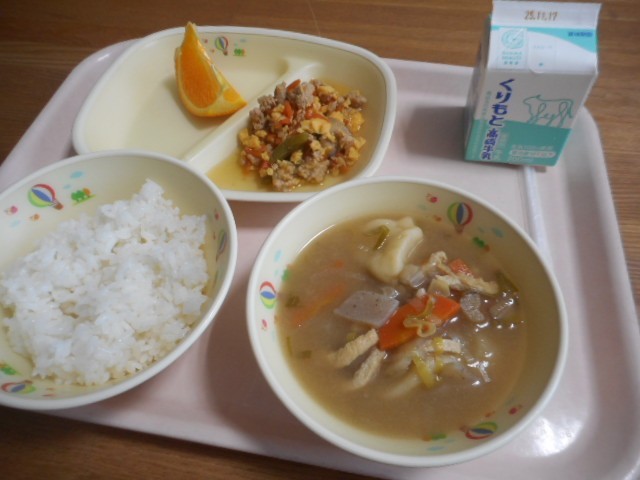 ごはん、牛乳、五目そぼろ丼の具、とっちゃなげ汁、オレンジ
