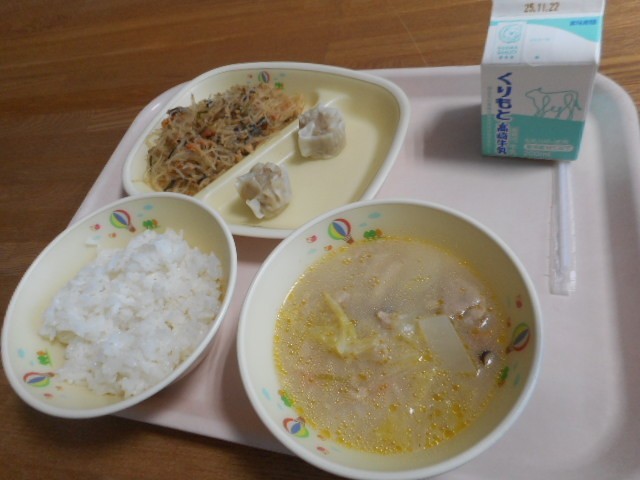 ごはん、牛乳、上州しゅうまい、マーボー春雨、コムタンスープ