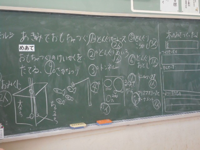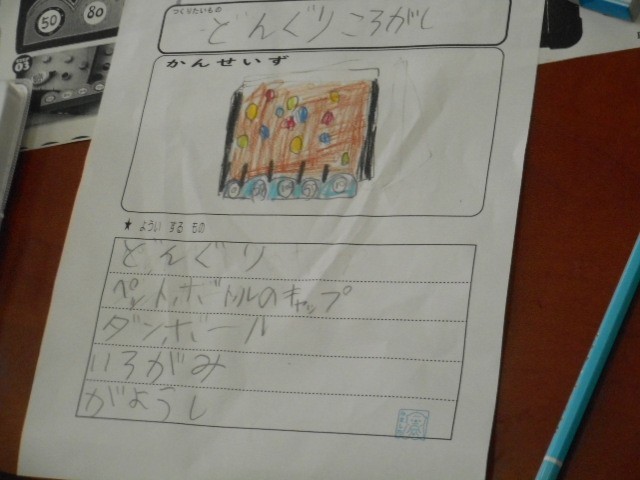 分担して秋の実を使ったおもちゃを作り、楽しみます