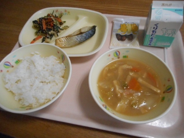 ごはん、牛乳、さばの塩焼き、田舎汁、ひじきのごま和え、黒糖ビーンズ