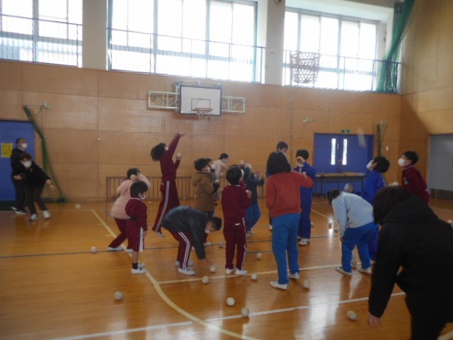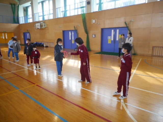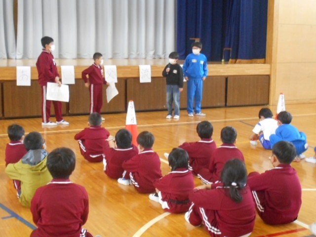 自己紹介、玉入れ、じゃんけん列車、うたと踊り「手のひらを太陽に」、輪っか渡しリレー