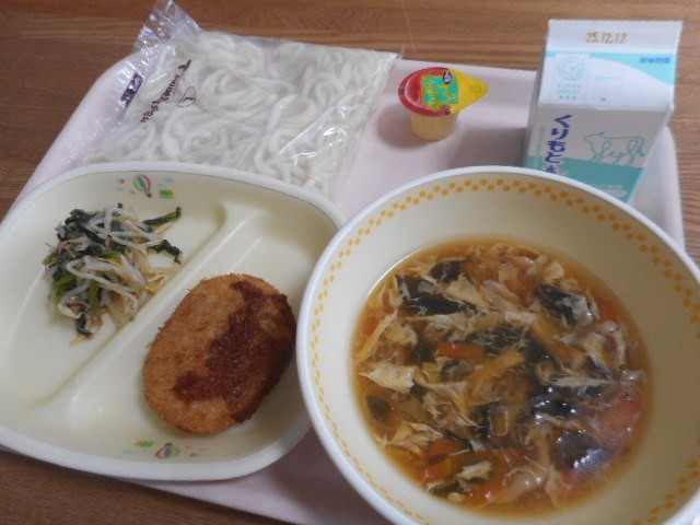 パックうどん、牛乳、コロッケ、かき玉うどんの汁、小松菜のオイル和え、ミニピーチゼリー