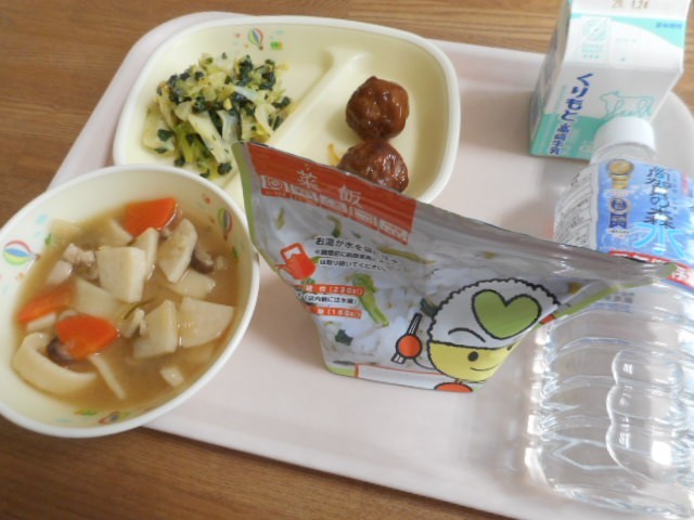 防災給食として、アルファ化米に水を入れて1時間おいて食べました。