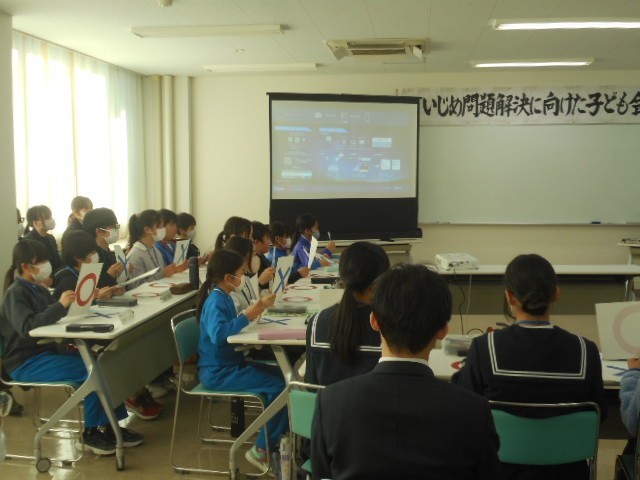 市内小中学校の代表が集まり、いじめ撲滅のための話し合いを行いました。
