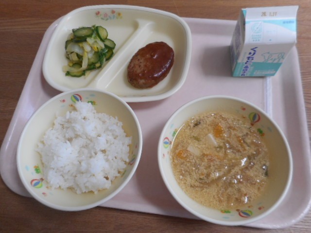 ごはん、牛乳、ハンバーグ奥多野ソース、かき玉汁。白菜の浅漬け
