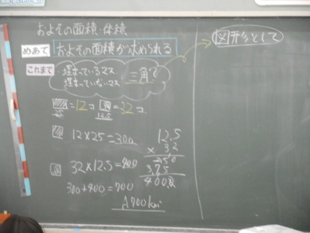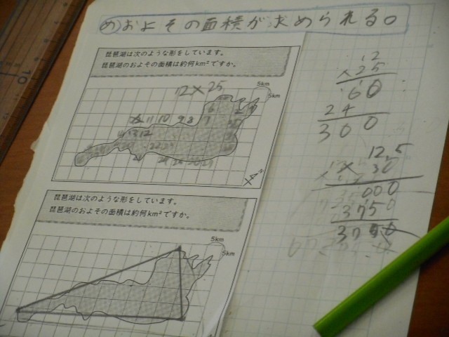琵琶湖を例に、三角形や四角形に見立て、およその面積を求める方法を考えました
