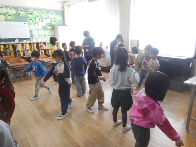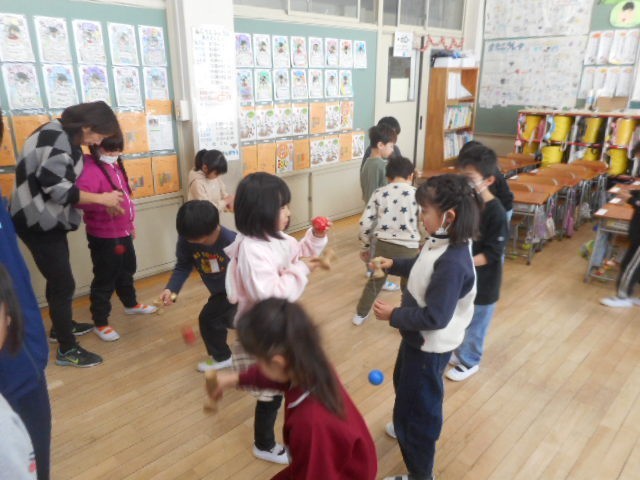 けん玉やこまなど、昔のあそびで楽しみました