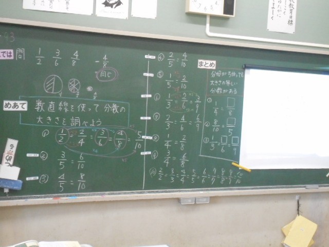 分母が違っても同じ大きさの分数を数直線から読み取りました