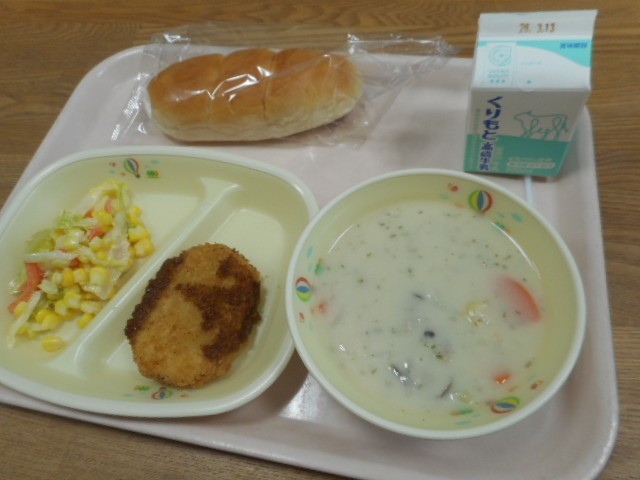小さめロールパン、牛乳、カボチャコロッケ、米粉シチュー、コーンサラダ