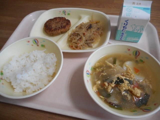 ごはん、牛乳、おさかなバーグ韓国風、トックのスープ、チャプチェ