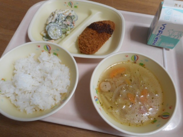 ごはん、牛乳、あじフライ、キャベツスープ、マカロニサラダ