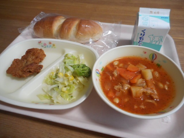 ロールパン、牛乳、クリスピーチキン、ポークビーンズ、コーンサラダ