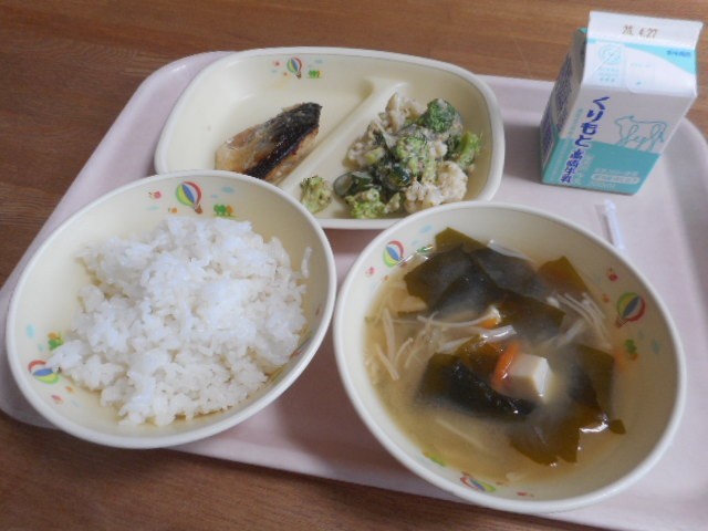 ごはん、牛乳、さばの塩こうじづけ、えのきのみそ汁、ごまマヨネーズ和え