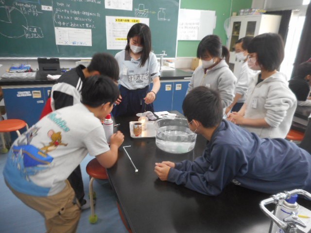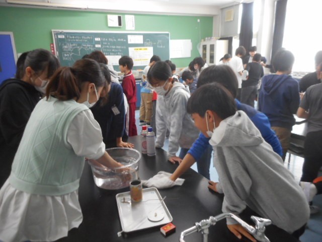 窒素、二酸化炭素、酸素の中でのろうそくの燃え方を実験で確かめました